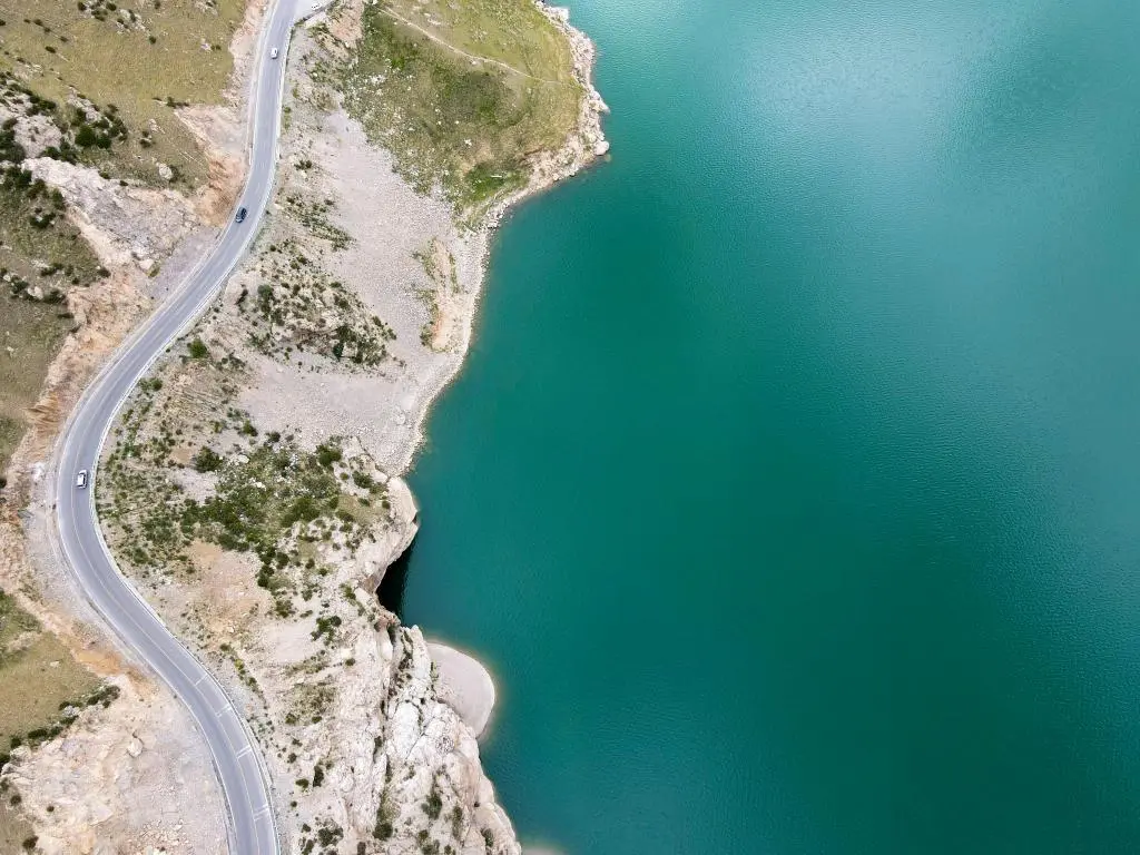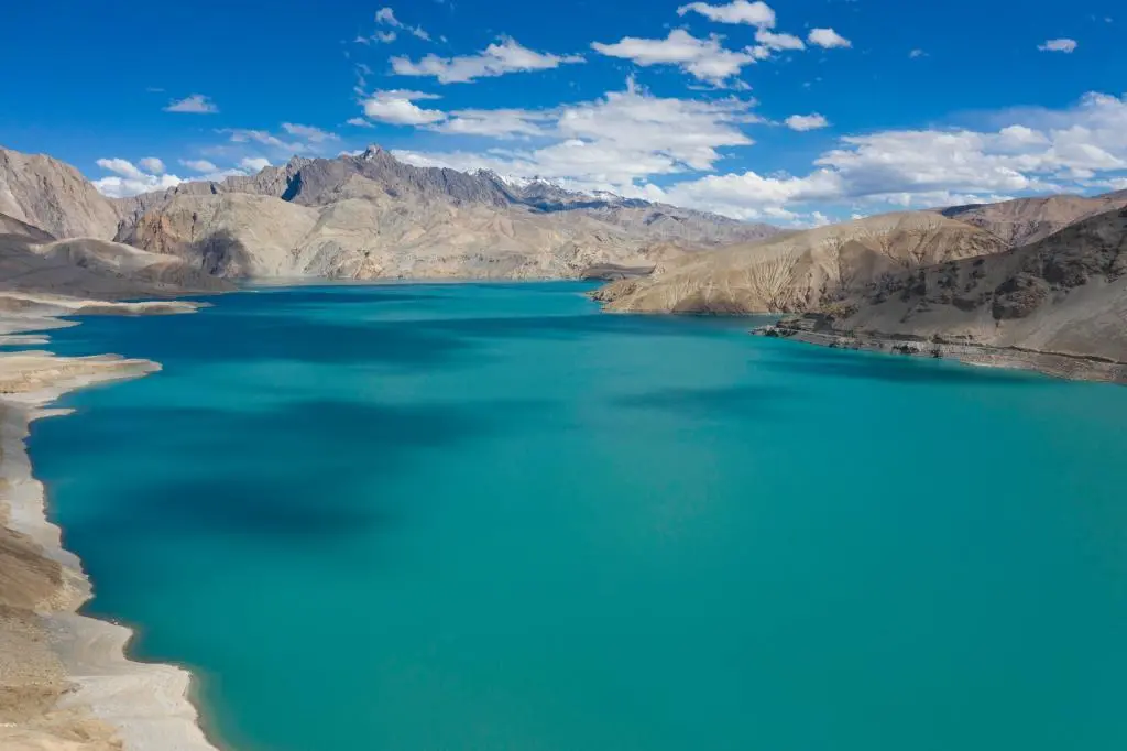 ↑位于新疆塔什库尔干塔吉克自治县的“班迪尔蓝湖”一角(2023年8月28日摄,无人机照片)。新华社记者 胡虎虎 摄