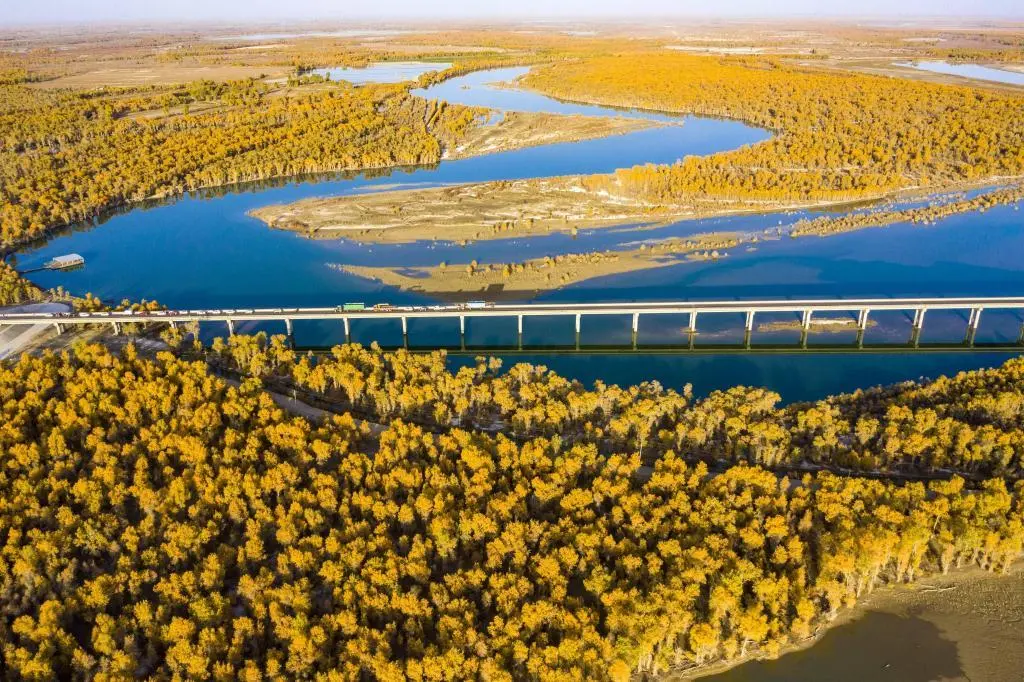 ↑这是2020年10月22日拍摄的新疆塔里木河畔的阿克苏地区沙雅县月亮湾景区内的胡杨林(无人机照片)。新疆南部沿塔里木河流域分布着约1500万亩胡杨林,是世界面积最大的胡杨林区,其中阿克苏地区沙雅县境内约有470万亩。新华社记者 胡虎虎 摄