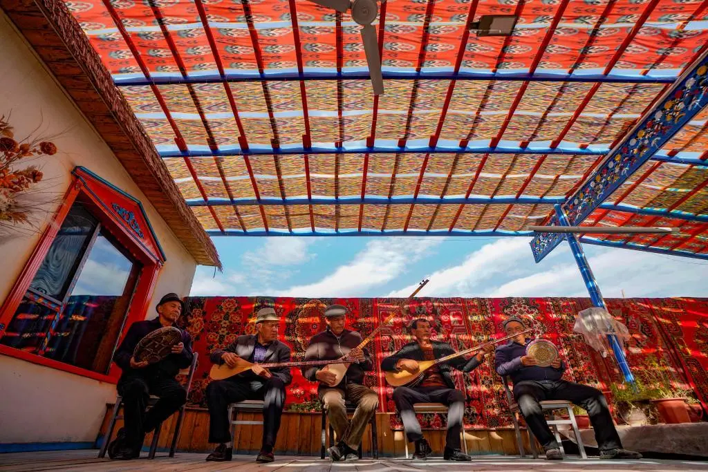 ↑在新疆阿克苏地区新和县加依村,非遗传承人努尔东·司马义(左二)和村民在院子里演奏(2024年10月30日摄)。加依村乐器制作历史悠久,被誉为“新疆民间手工乐器制作第一村”。新华社记者 陈朔 摄