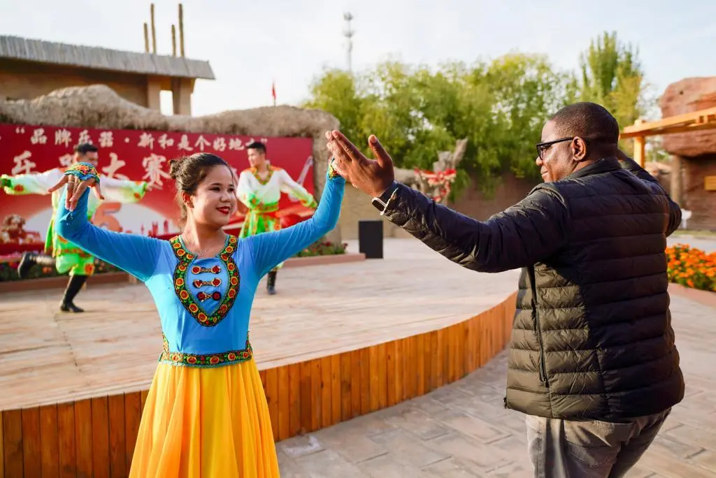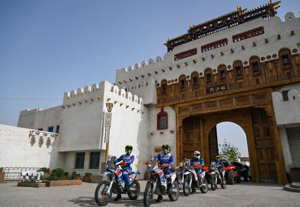 ↑2023年6月1日,在新疆和田地区约特干故城景区,2023年环塔拉力赛参赛代表参加旅游展示活动。新华社记者 胡虎虎 摄