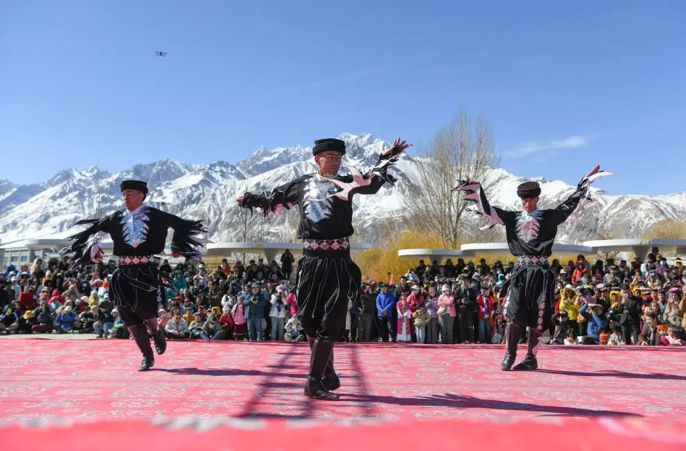 ↑在新疆塔什库尔干塔吉克自治县“彩云人家”民俗村,演员为观众表演国家级非物质文化遗产——鹰舞(2025年3月22日摄)。新华社记者 胡虎虎 摄