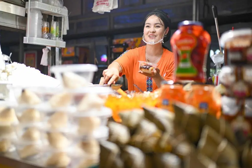 ↑2024年6月4日,在新疆和田夜市,商户麦斯图热姆·阿卜杜穆柯依提为顾客制作酸奶粽子。新华社记者 胡虎虎 摄