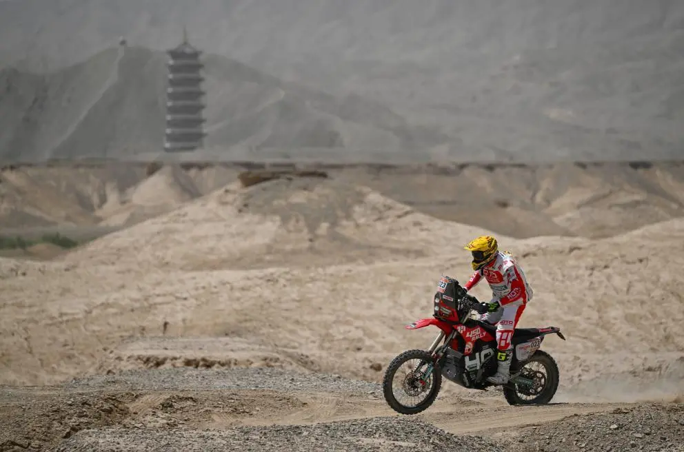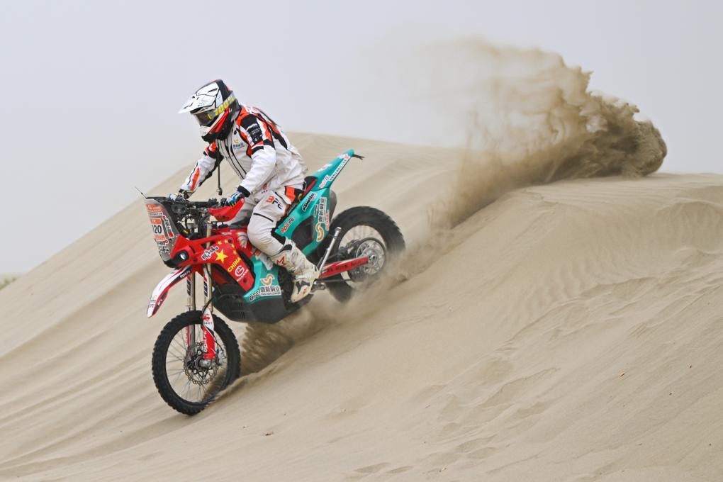 ↑6月1日,鼎新铜业沸铁拉力车队车手张仟岳佟在第十赛段比赛中。新华社记者 辛悦卫 摄