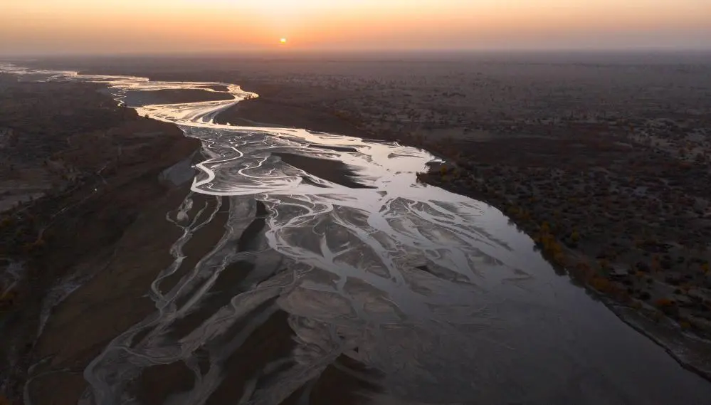 ↑这是在塔克拉玛干沙漠腹地拍摄的新疆于田克里雅河国家湿地公园(2019年11月10日摄,无人机照片)。新华社记者 胡虎虎 摄