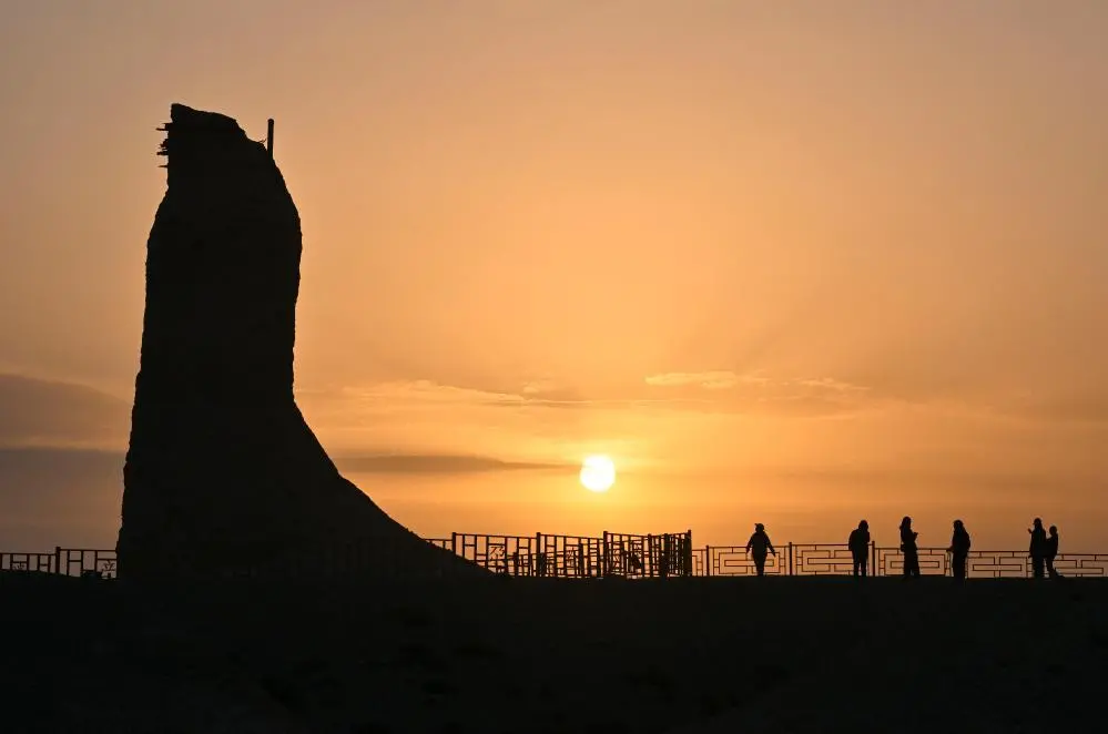 ↑游客在克孜尔尕哈烽燧参观(2024年10月31日摄)。克孜尔尕哈烽燧,位于新疆阿克苏地区库车市西北,历经2000多年的风雨,至今雄姿犹存,是目前新疆境内保存最完整,时代最久远的烽燧。2014年,该烽燧作为中国、哈萨克斯坦和吉尔吉斯斯坦联合申遗的“丝绸之路:长安-天山廊道的路网”的组成部分被列为世界文化遗产。新华社记者 胡虎虎 摄