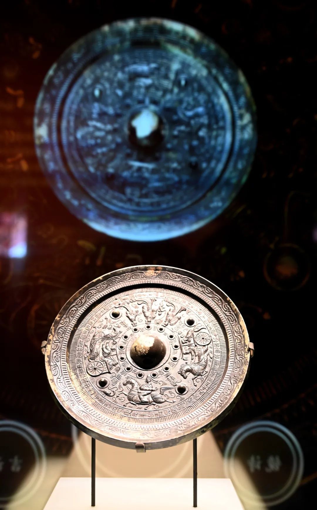 “精品展”陈列昭君出塞镜、石棺床等国宝级文物,尽显汉魏工艺巅峰。其中国家一级文物——昭君出塞铜镜最为瞩目。铜镜表面详细记录了昭君出塞的故事,据了解,它是目前已知最早记载昭君出塞故事的文物,具有珍贵的史料价值和艺术价值。