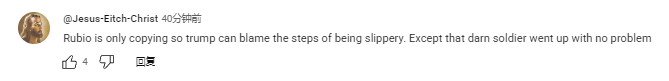 此外,在相关报道评论区,有网友质疑鲁比奥是在“假装跌倒”,从而为特朗普“挽尊”,“鲁比奥只是在模仿,这样特朗普就可以指责是楼梯太滑了。但那个士兵就没事。”