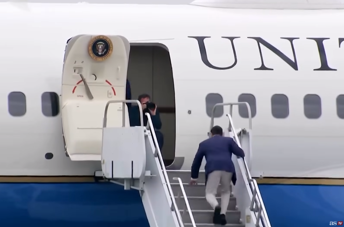 当地时间8日,特朗普登机时险些跌倒。图源:外媒