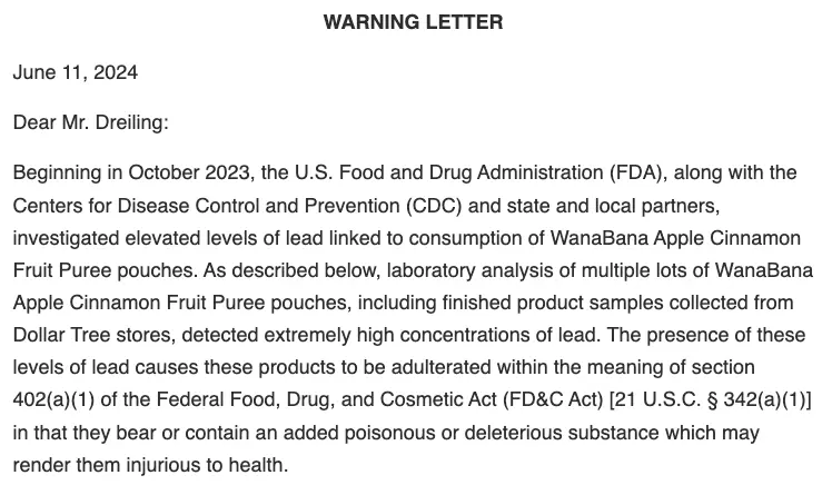 [6].https://www.fda.gov/food/outbreaks-foodborne-illness/investigation-elevated-lead-chromium-levels-cinnamon-applesauce-pouches-november-2023#::text=November%2013%2C%202023&text=The%20NCDHHS%20investigation%20identified%20WanaBana,extremely%20high%20concentrations%20of%20lead.