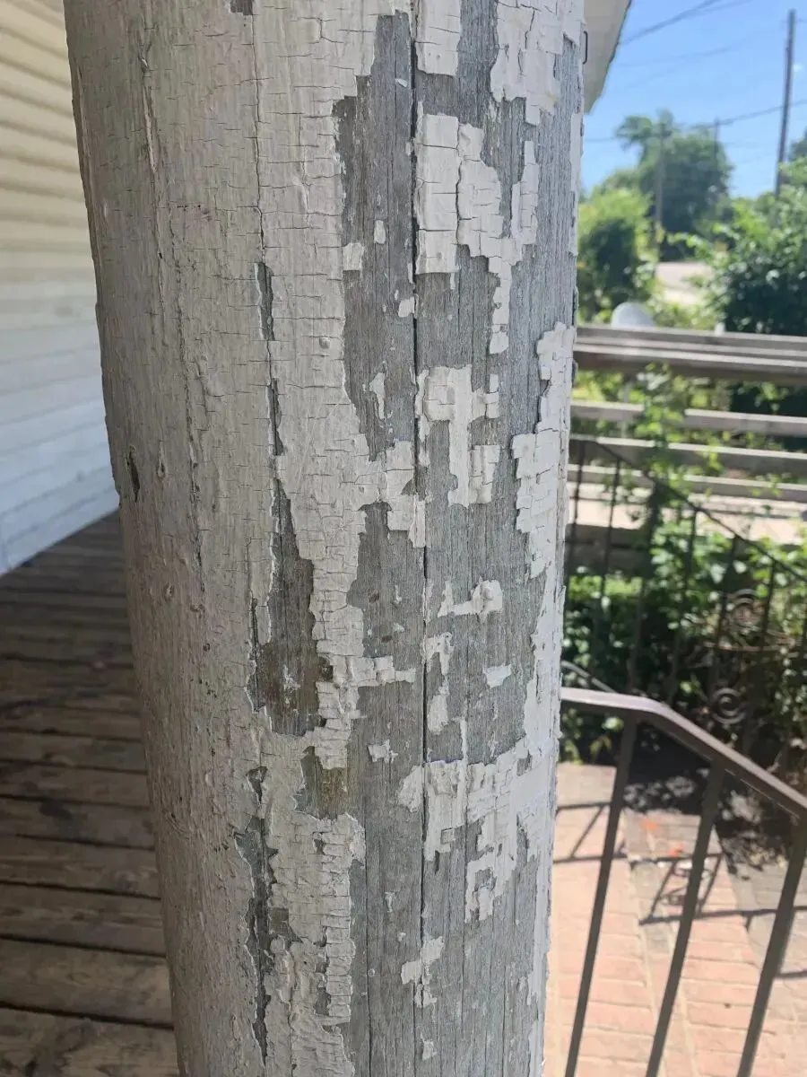 达姆市居民 Brooks 家门廊的木柱,铅漆脱落