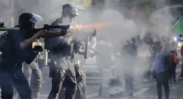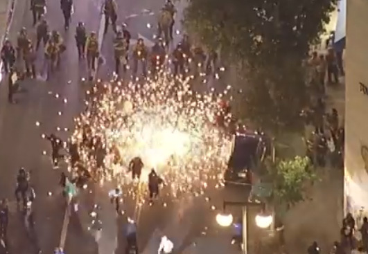 美国执法人员驱散洛杉矶抗议人群 视频截图