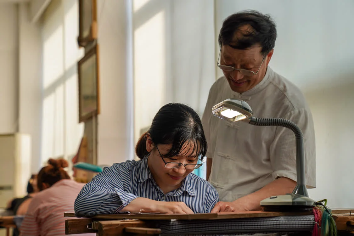 6月6日,在东台嘉丽发绣厂,东台发绣传承人陈伯余指导徒弟绣制发绣作品。新华社记者 彭奕凯 摄