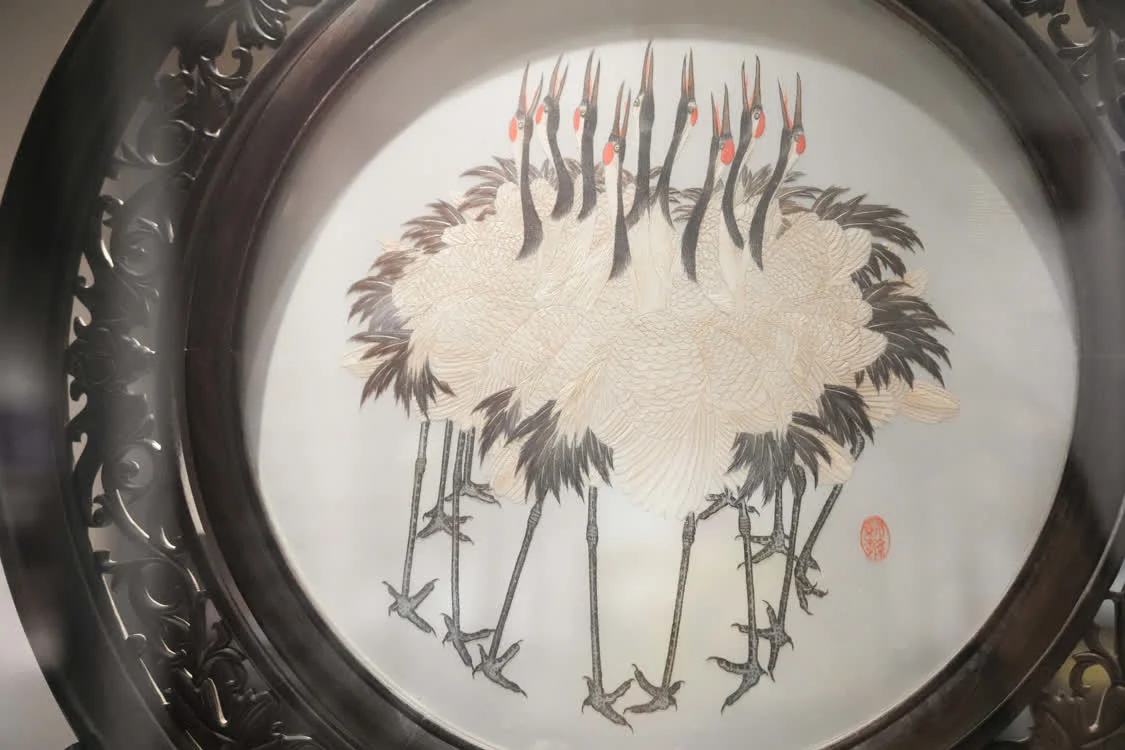 6月6日在东台市博物馆拍摄的以丹顶鹤为题材的发绣作品。新华社记者 薛宇舸 摄