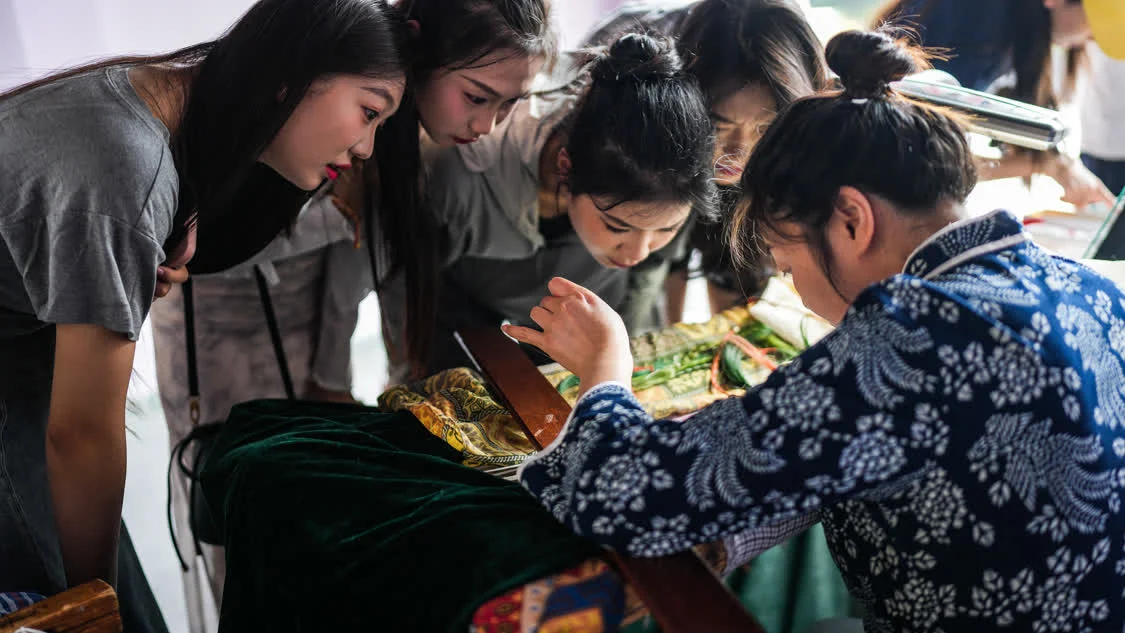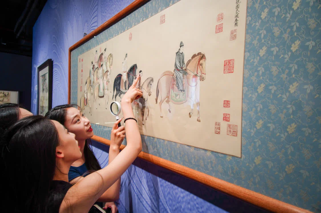 6月6日,在东台西溪天仙缘景区内的东台发绣展示馆,游客观赏、讨论发绣作品《虢国夫人游春图》。新华社记者 徐速绘 摄