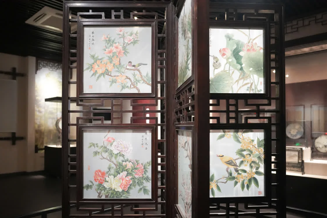6月6日在东台市博物馆拍摄的以花鸟为题材的发绣作品。新华社记者 薛宇舸 摄