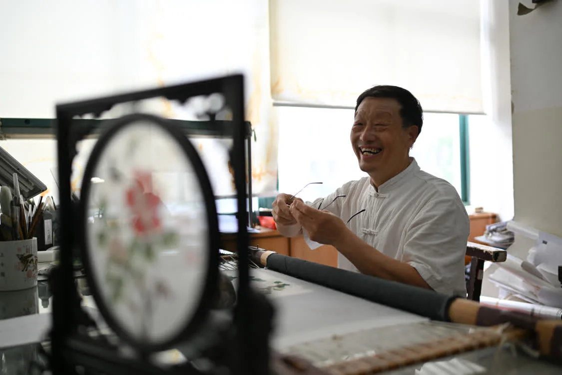6月6日,在东台嘉丽发绣厂,东台发绣传承人陈伯余工作前擦拭眼镜。新华社记者 辛悦卫 摄