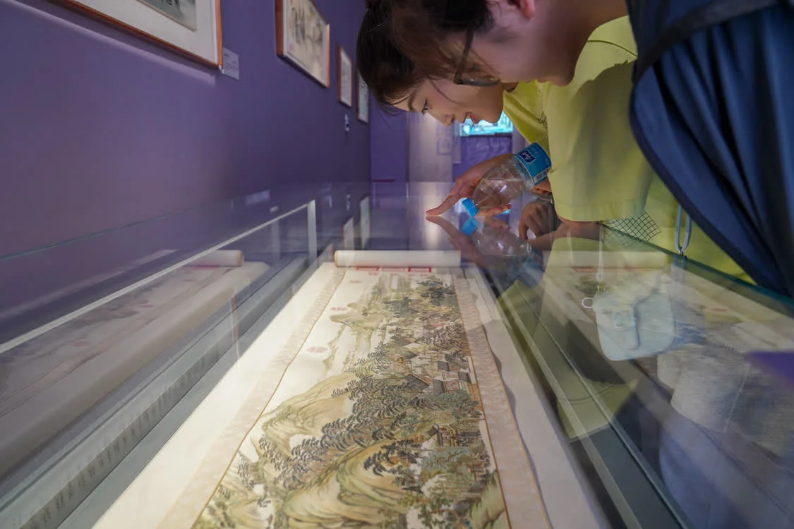 6月6日,在东台西溪天仙缘景区内的东台发绣展示馆,游客观赏发绣长卷《姑苏繁华图》。新华社记者 彭奕凯 摄