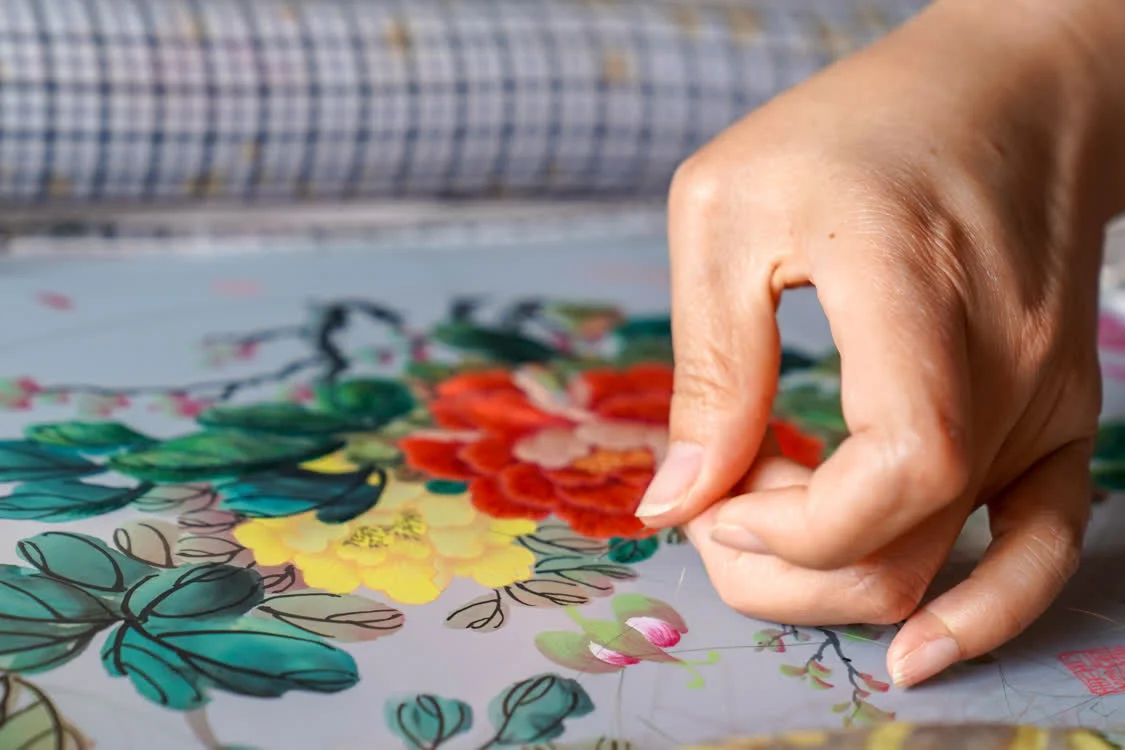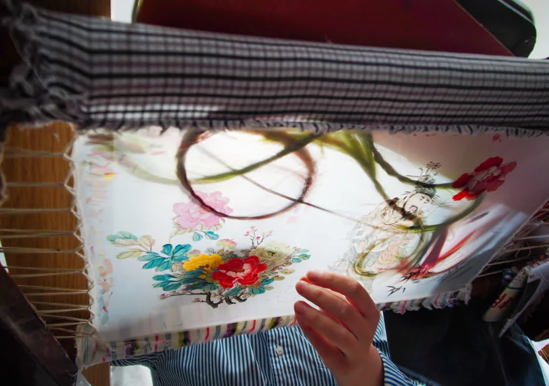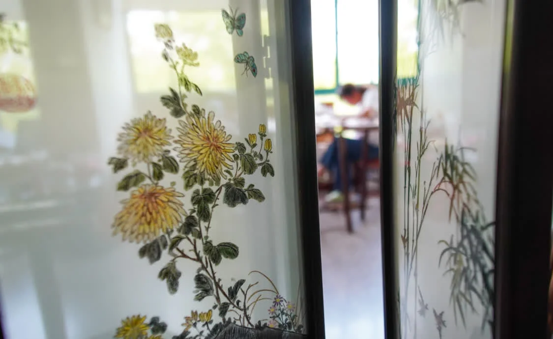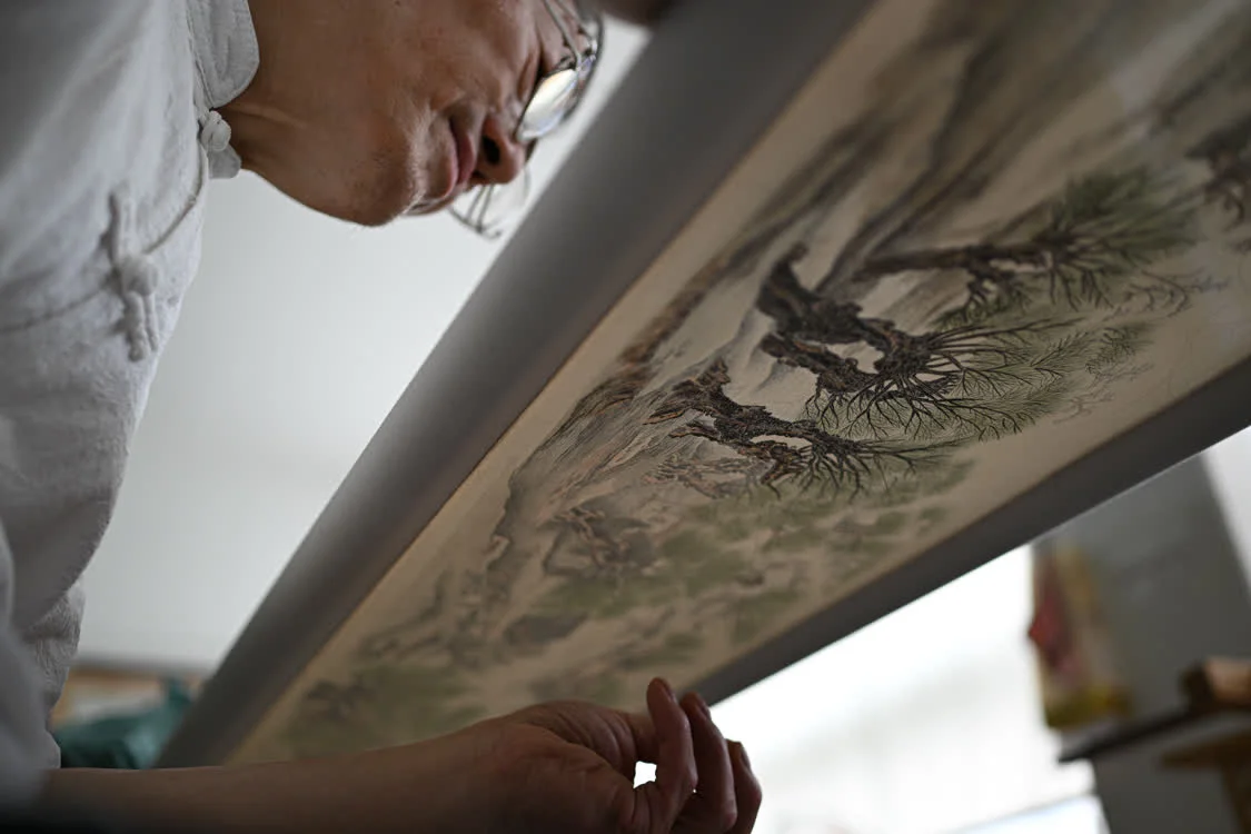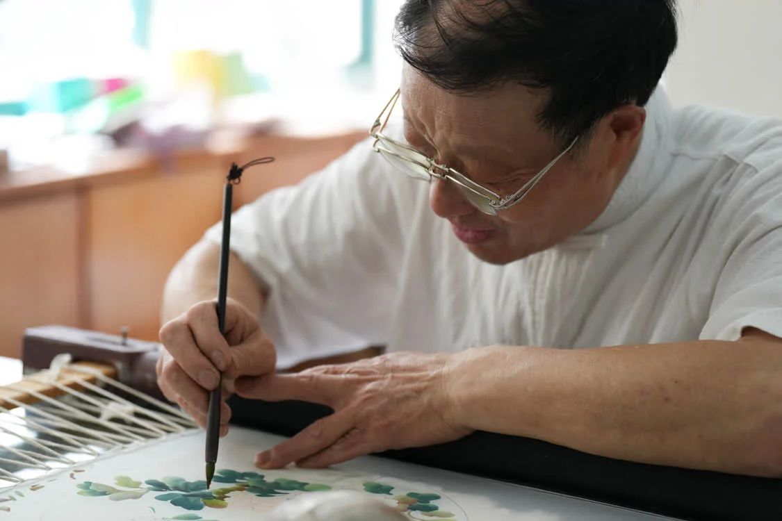 6月6日,在东台嘉丽发绣厂,东台发绣传承人陈伯余用颜料勾画样稿。这一环节是发绣的前置,称为“勾绷落样”。新华社记者 薛宇舸 摄