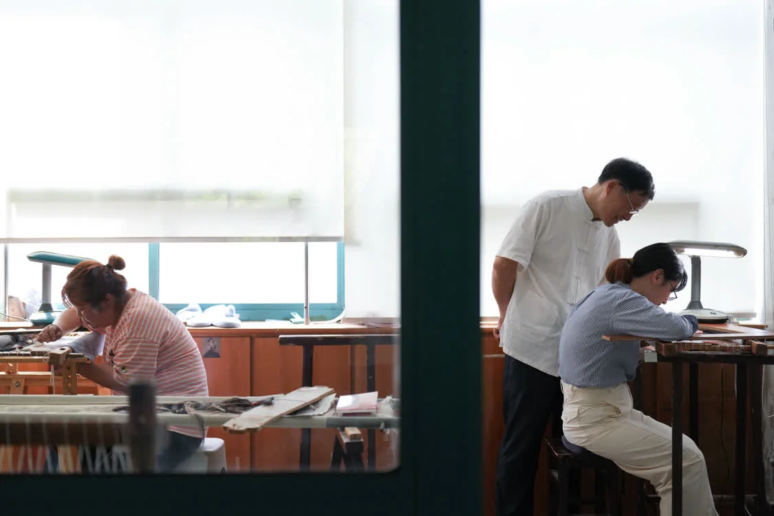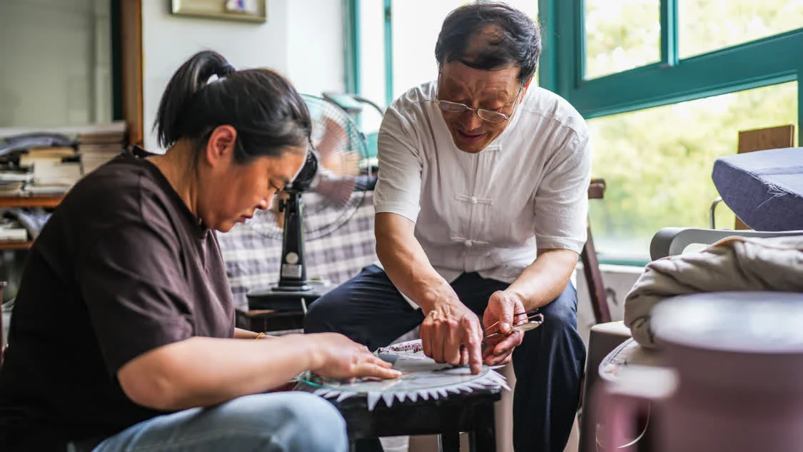 6月6日,在东台嘉丽发绣厂,东台发绣传承人陈伯余指导徒弟装裱一幅双面发绣作品。新华社记者 陶亮 摄