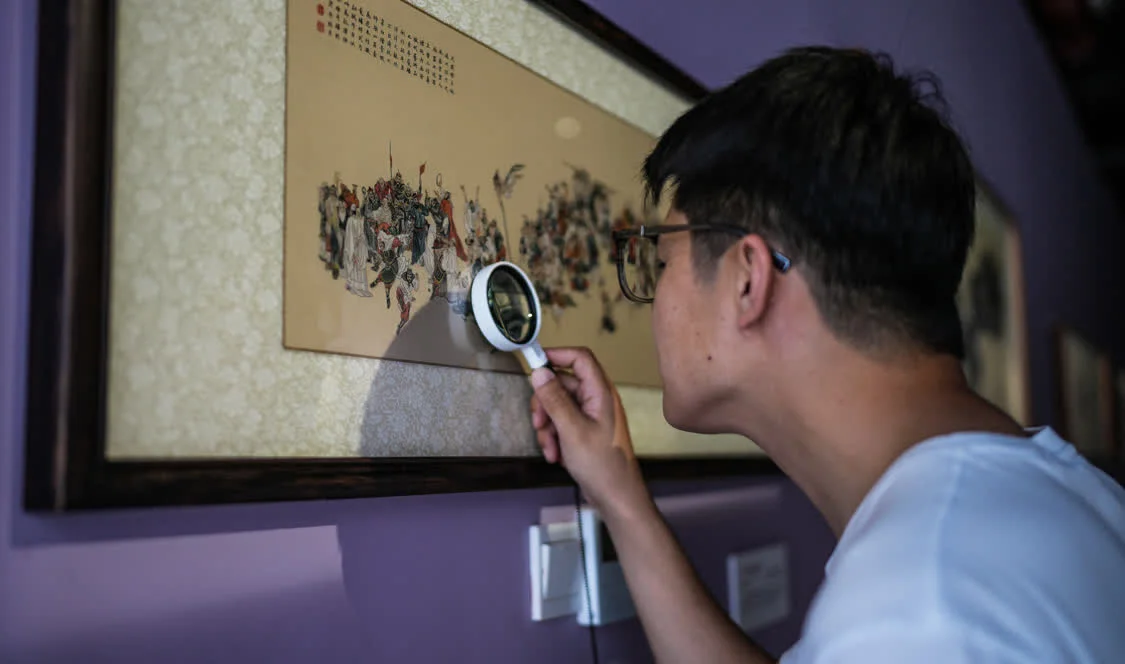 6月6日,在东台西溪天仙缘景区内的东台发绣展示馆,游客用放大镜观赏发绣作品《一百零八将》。新华社记者 陶亮 摄