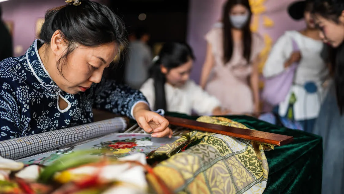 6月6日,在东台西溪天仙缘景区内的东台发绣展示馆,绣娘现场展示绣工。新华社记者 彭奕凯 摄