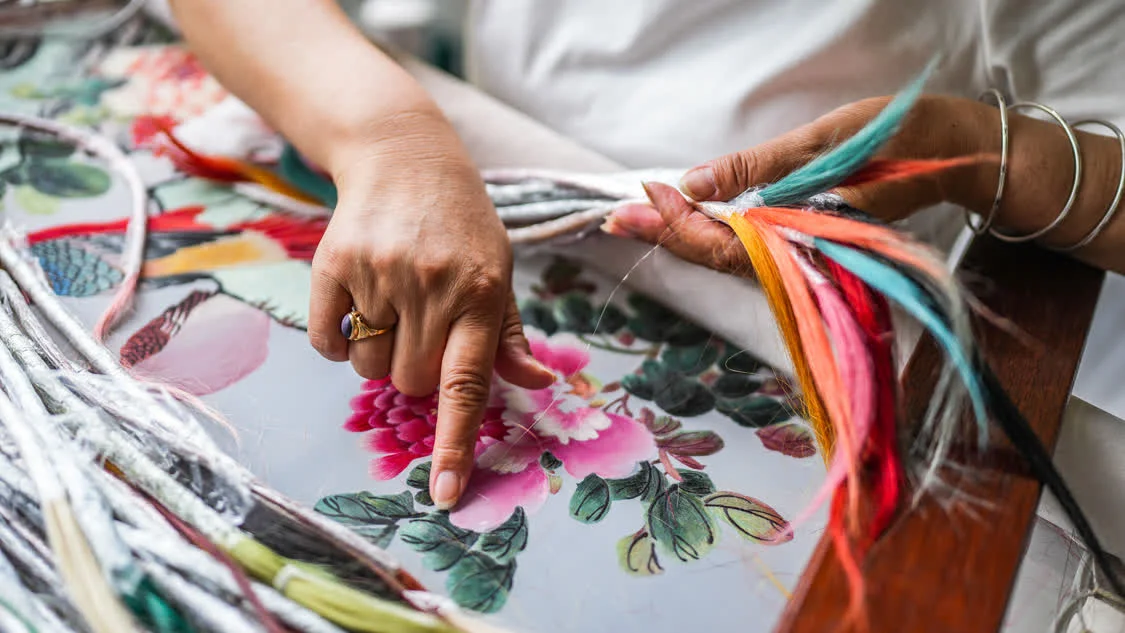 东台发绣又称“墨绣”,是以人发为“线”,用苏绣传统针法进行绣制的一种传统刺绣工艺,作品质感纹理别具一格。它源于唐代信女用发丝绣制佛像的习俗,至今已有1300多年历史。东台发绣曾长期主要由寺庙和居士收藏,传承几近佚失,二十世纪五十年代,苏州刺绣研究所对发绣技艺进行系统发掘整理研究,经画师、绣工们积极创作推广,这一古老技艺在江苏盐城东台市得到恢复、发展、壮大。2021年,东台发绣被列入国家级非物质文化遗产代表性项目名录。陈伯余是东台发绣传承人,从事发绣创作设计40多年。在总结前人技艺的基础上,陈伯余潜心研究,创作适应各类绣品的样稿,除花鸟、文人画、历史题材外,还积极创作表现当地文化、风土人情的作品,多幅作品获国家、省级奖项。经过数十年发展,东台发绣不断创新。发绣艺人们使用染色发丝,改传统“墨绣”为“彩绣”;为了丰富作品表现力,艺人在继承传统针法的基础上,根据人发质地适宜表现动物毛绒效果的特征,缩短针距、加密线距,增强质感效果;同时拓展多种针法,使作品的浓淡、干湿、远近、深浅饶有笔意。东台发绣不仅作为非物质文化遗产纵贯古今,更在当下存在于人们的生活中。东台发绣带着历史的沉淀,在发绣艺人们的传承中走向未来。