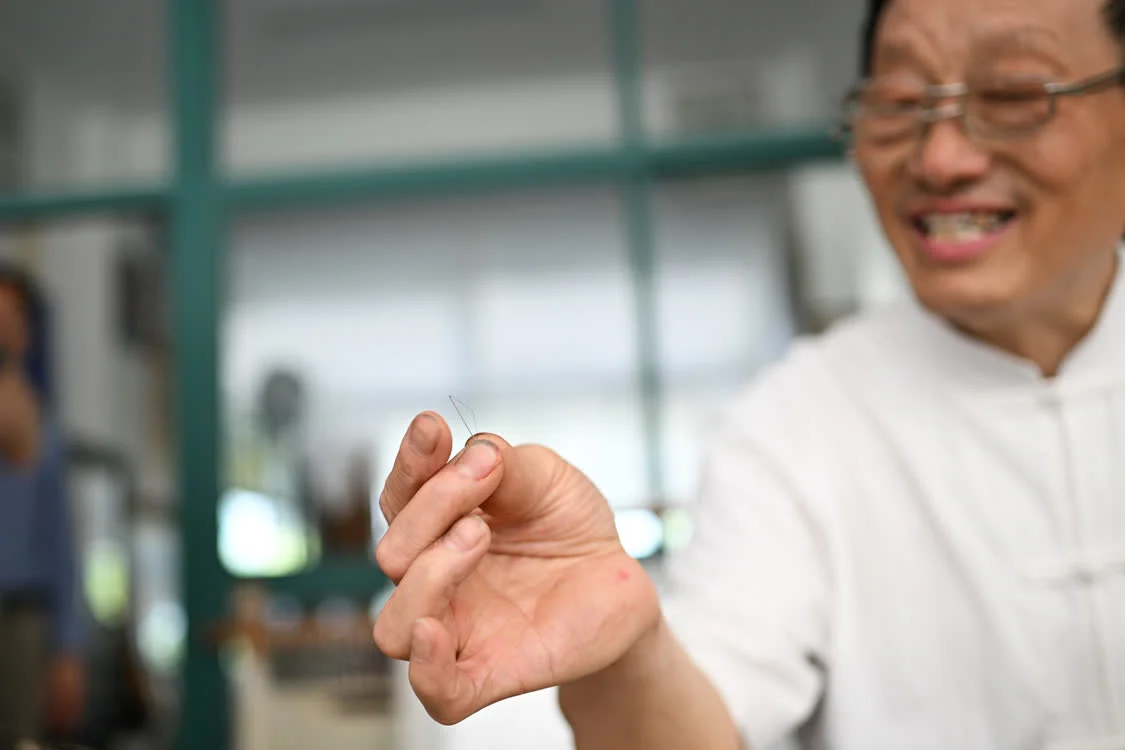 6月6日,在东台嘉丽发绣厂,东台发绣传承人陈伯余展示发绣所用的“12号针”。新华社记者 辛悦卫 摄
