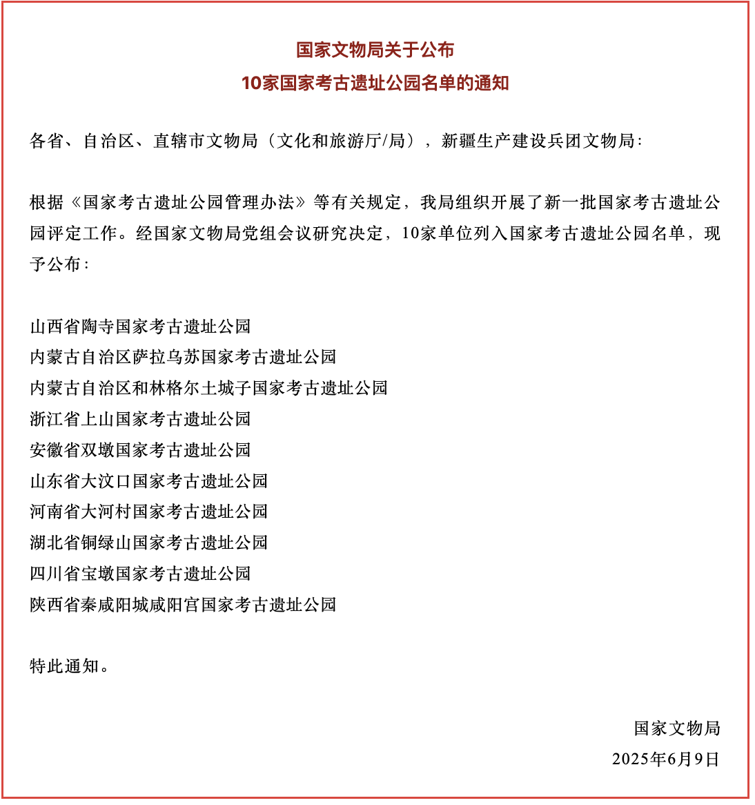 根据《国家考古遗址公园管理办法》等有关规定,国家文物局组织开展了新一批国家考古遗址公园评定工作。经国家文物局党组会议研究决定,10家单位列入国家考古遗址公园名单: