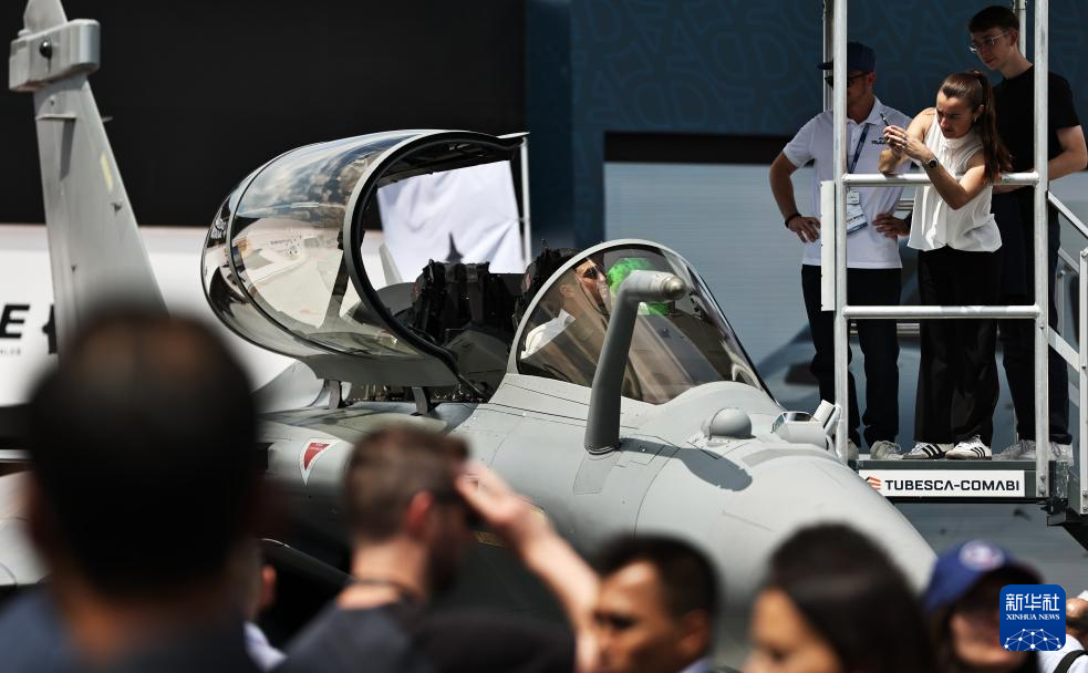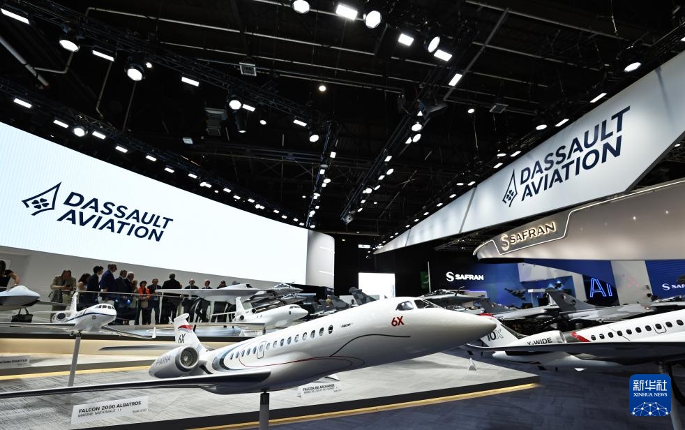 6月17日,在法国巴黎近郊布尔歇机场举行的第55届巴黎航展上,人们参观达索公司展区。