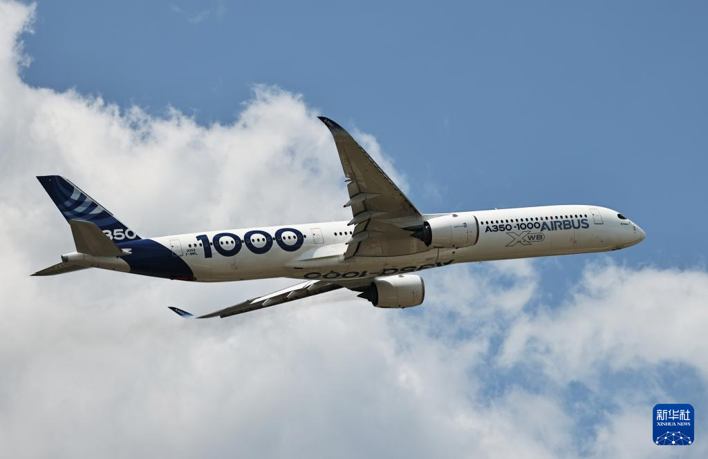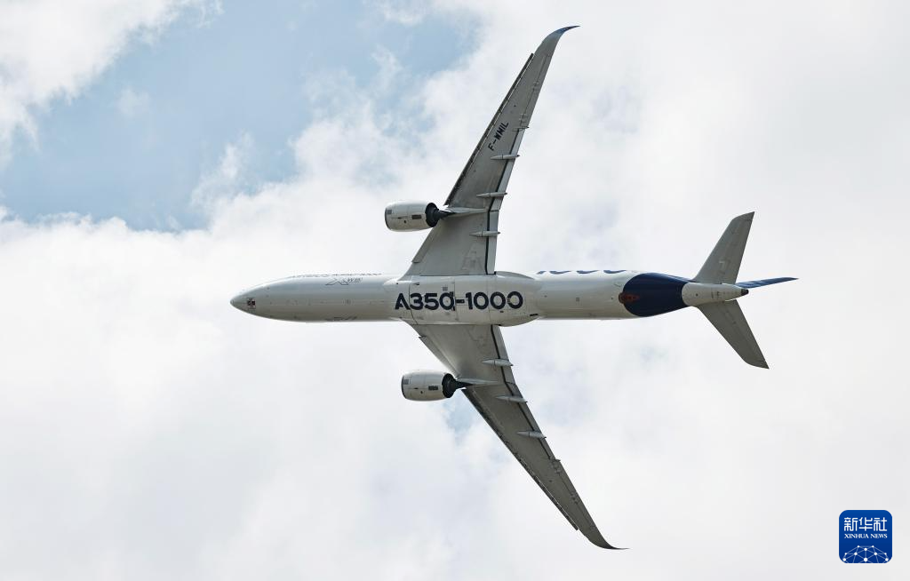 6月17日,在法国巴黎近郊布尔歇机场举行的第55届巴黎航展上,空客A350-1000客机进行飞行表演。