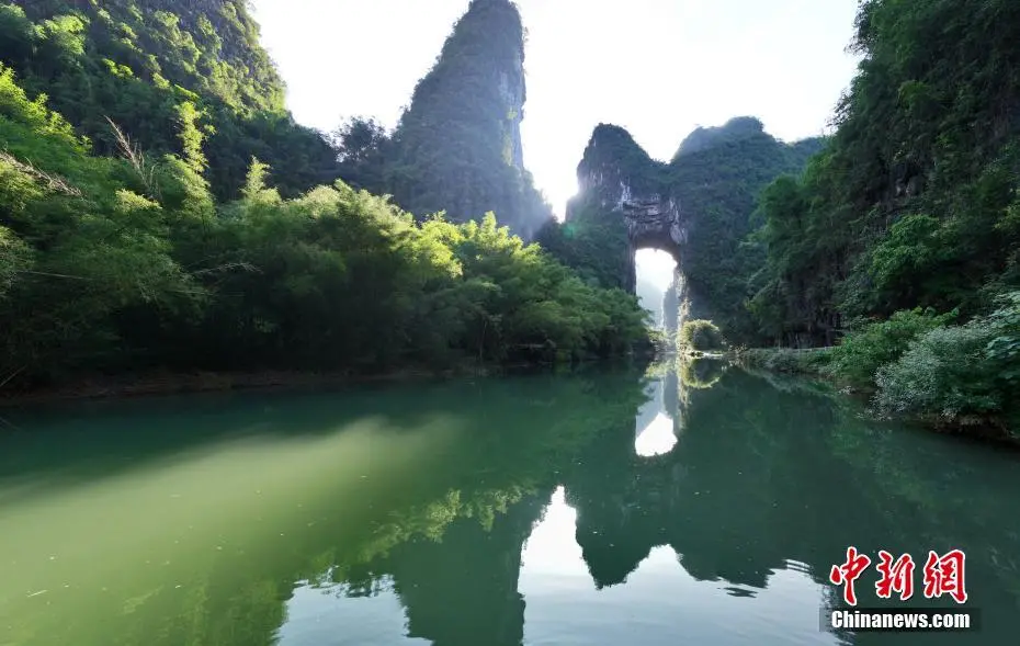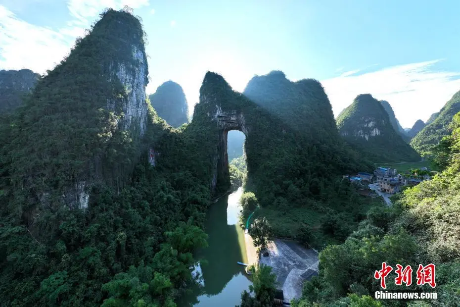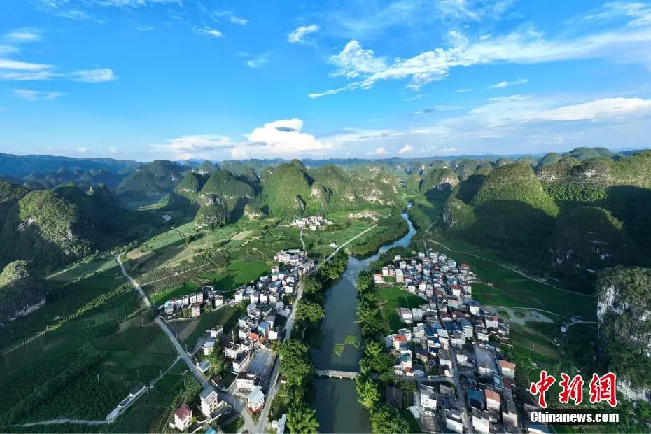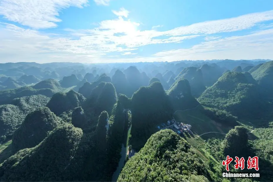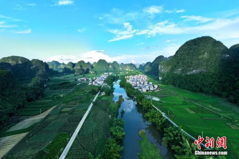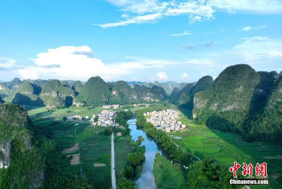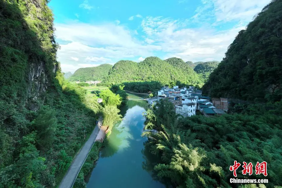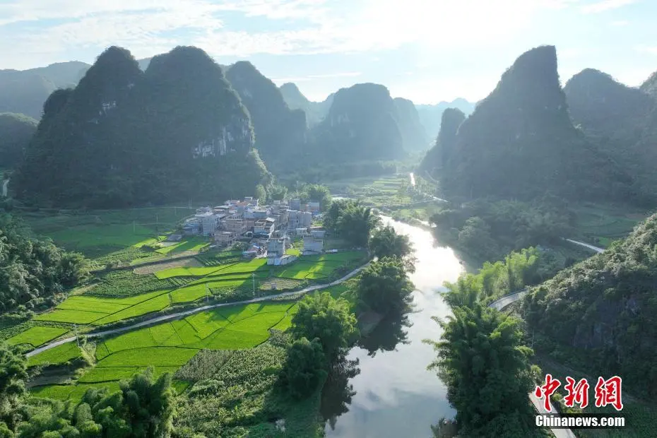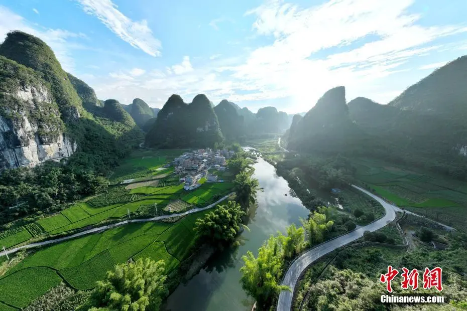 近日,位于广西河池市罗城仫佬族自治县的广西罗城国家地质公园内,群峰竞秀,独特的喀斯特地貌与河流、青山、民居、道路交相辉映,风光旖旎如画。图为航拍罗城国家地质公园风光。廖光福 摄