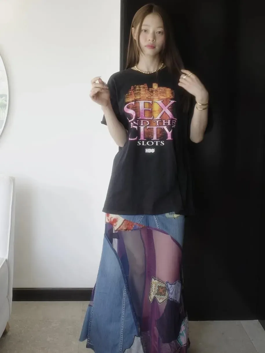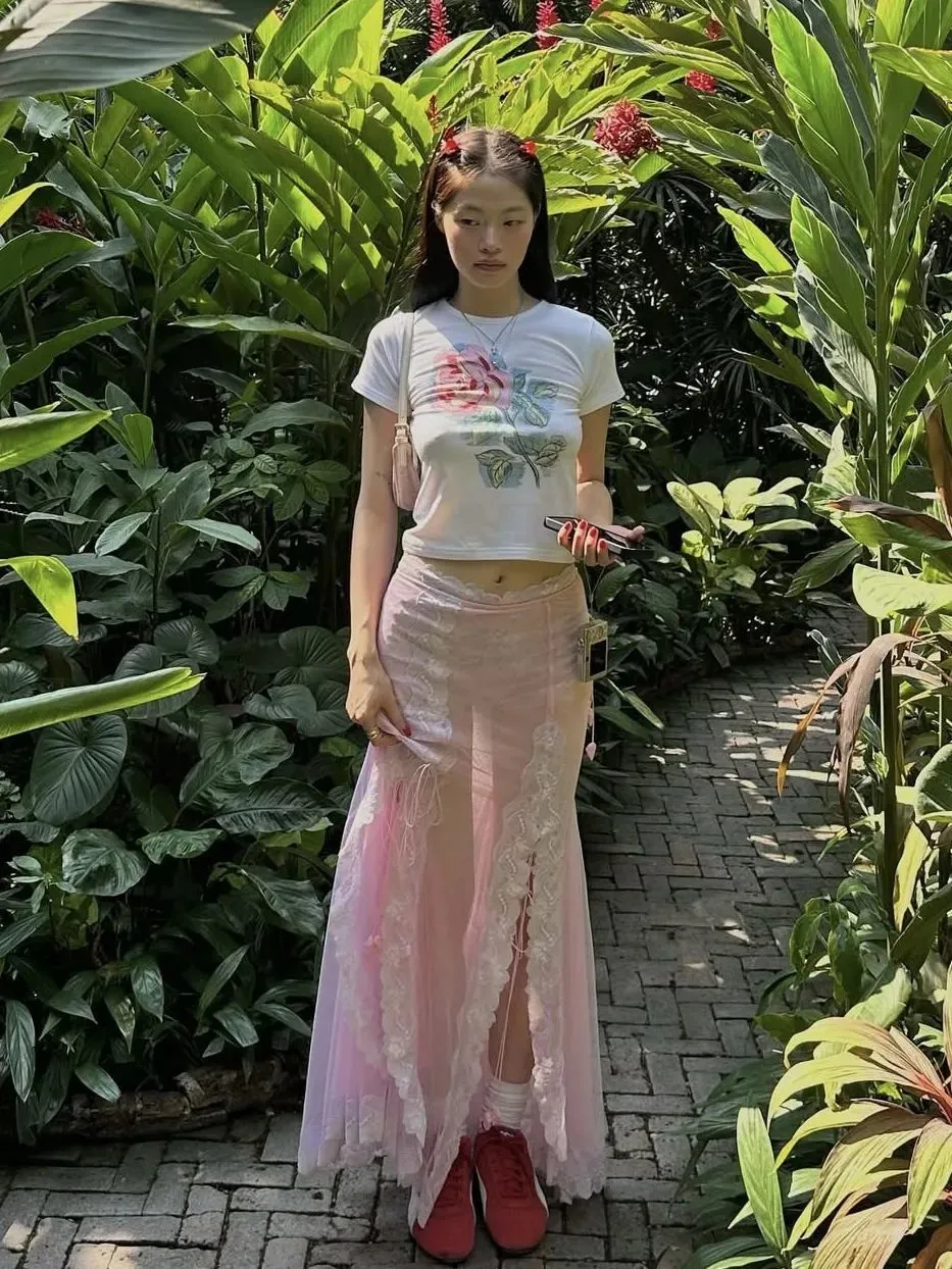 此外,将单品从学院场景中解放出来,混搭同样是打造“学院T”风格的重要方式,就像金高银这身造型,小雏菊T恤配透视蕾丝半裙,厚重棉质与轻盈柔纱的对冲让look瞬间显得大不一样。