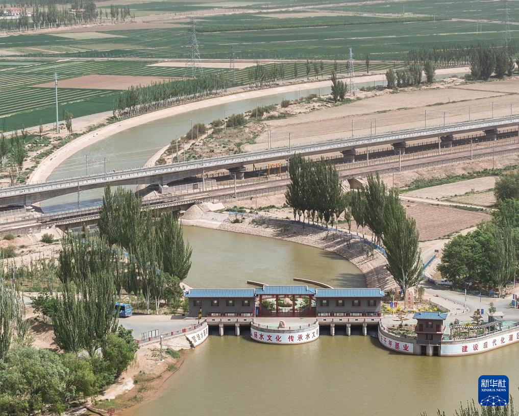 这是5月28日拍摄的内蒙古巴彦淖尔市临河区境内的总干渠第二分水枢纽(无人机照片)。 新华社记者 马金瑞 摄