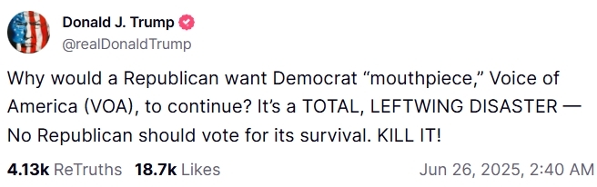 据“今日俄罗斯”6月25日报道,特朗普当天在他所主导的“真实社交”平台发帖,呼吁共和党人支持他关闭由美国政府资助的新闻机构美国之音(VOA)。后者成立于二战时期的1942年,本来是一家用来对抗纳粹展开的宣传战的机构,并在冷战时期成为了美国散播亲美信息的核心工具之一。