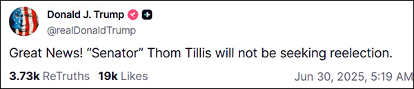 【文/观察者网 王一】在因投票反对“大而美”税收与支出法案而遭到特朗普的猛烈抨击后,美国北卡罗来纳州共和党籍联邦参议员汤姆·蒂利斯(Thom Tillis)于当地时间6月29日宣布,他明年不会寻求连任。