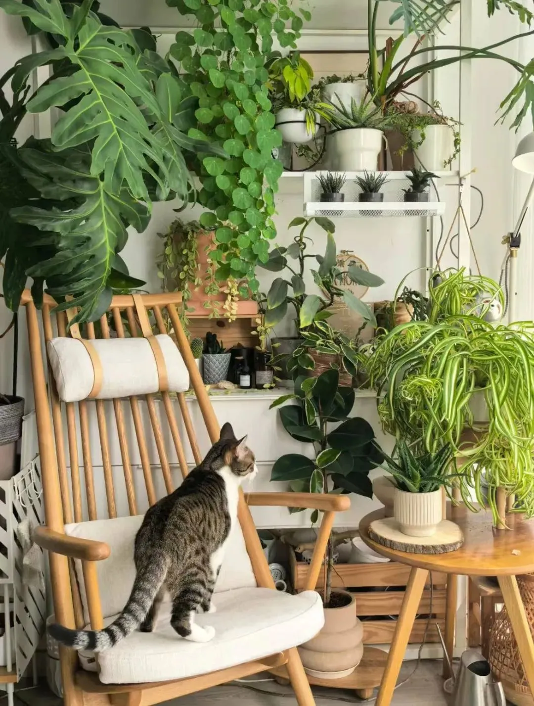 猫咪天生会跑酷,也喜欢扒拉东西。花盆一旦放在桌面或者侧边柜上,在忘记浇水时就会变得很轻,容易被宠物打翻。所以,桌上的花盆一定要稳。可以将相同体量的花盆固定在一个有侧沿的框架结构里增强稳定度,或者在其四周用相框、扩香石等其他小物件形成阻隔,既保护宠物安全,也是对植物负责。