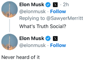 特朗普在“真实社交”上所发帖文很快被截图转引到社交媒体X上,一名博主在转引时配文称:“特朗普刚刚就埃隆·马斯克在‘真实社交’上发帖。” 马斯克则在这则转帖下留言称:“什么‘真实社交’,没听说过。”美国《野兽日报》称,马斯克疑似是在嘲讽特朗普。