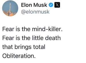 此外,另一名美国博主就特朗普的帖文评论说:“他(特朗普)害怕了。”马斯克回复说:“恐惧是思维杀手。恐惧是带来彻底毁灭的小小死神。”这是美国小说家弗兰克·赫伯特的经典科幻小说《沙丘》中的著名台词。