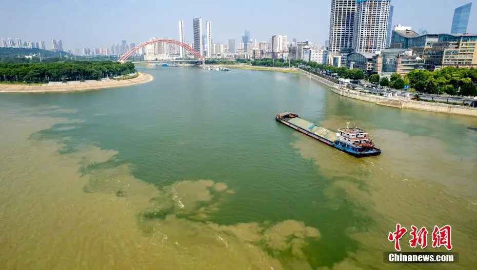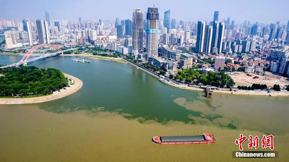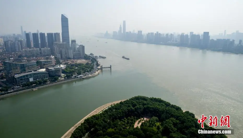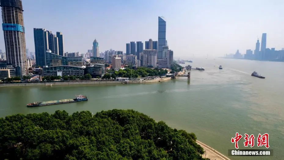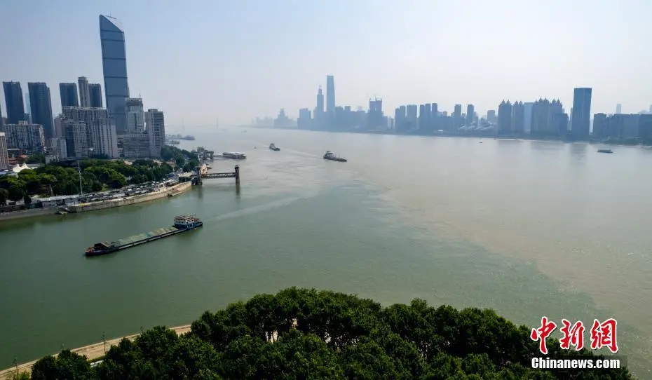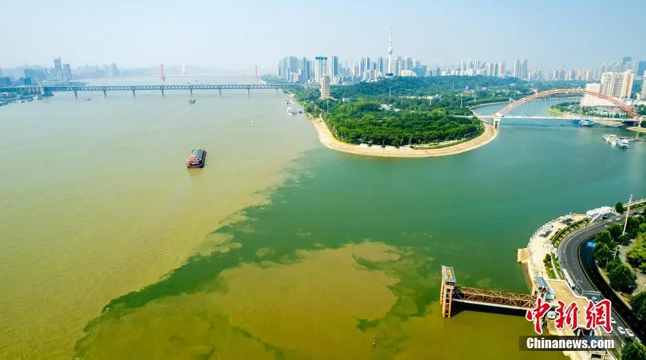 7月7日,航拍长江和汉江交汇处的湖北武汉汉口龙王庙江段。汉江水碧波荡漾,长江水呈现浊黄色,两江交汇口呈现“泾渭分明”的景观。(无人机图片)中新社记者 张畅 摄