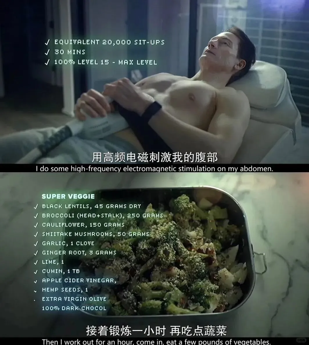 Netflix的纪录片《长生不死:硅谷富豪的逆龄人生》记录了他为“青春永驻”做出的努力,每天早上5:30起床,精准摄入1977大卡的热量,早餐是精确到克的"超模饲料套餐"(黑扁豆+西兰花+82年的苹果醋),午餐是坚果布丁配一勺蜂蜜(这勺蜂蜜是他全天唯一的放纵时刻),并且会在11点半前吃完,同时每天早上、晚上、睡前都会吃大量五彩斑斓的营养补剂。