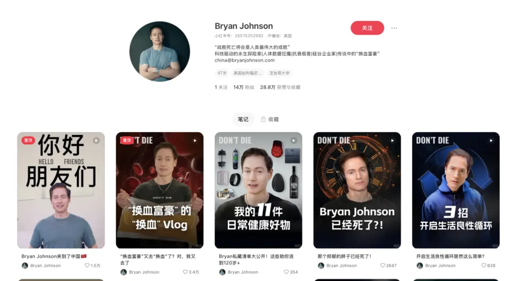47岁的Bryan Johnson因其追求长寿的“疯狂”行为——祖孙三代换血、使用多次电击阴茎以增强勃起能力,吸引了众多媒体的关注,并拥有近400万社交媒体粉丝。