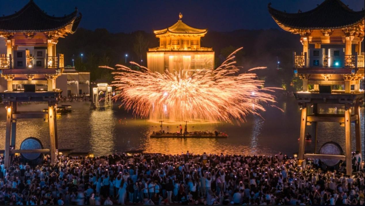 The "iron fireworks" (Da Tiehua) performance at Wunvzhou Scenic Area has attracted numerous tourists.婺女洲景区的“打铁花”表演吸引了众多游客