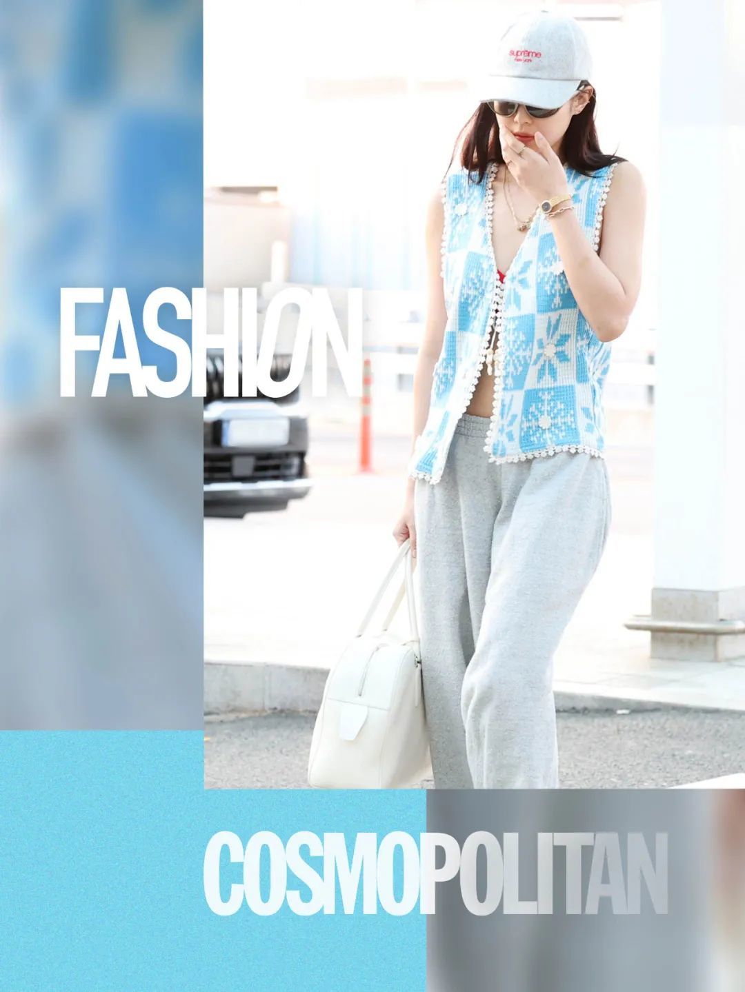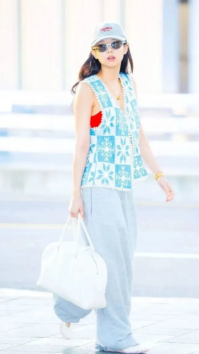 Jennie近日现身仁川机场的造型刷遍各大网站,她以天蓝色钩针背心叠搭红色Bra Top,搭配灰色运动裤,慵懒中透着一丝俏皮。但最引人注目的,是她脚下那双Vibram五趾鞋——极简的轮廓与分趾设计,既像前卫的艺术品,又完美契合长途飞行的舒适需求。