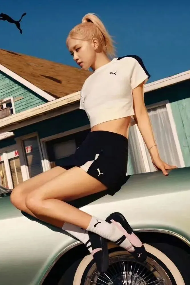 自带运动属性的它搭配起运动造型也十分完美,ROSÉ的这套简约造型就是最好的证明。