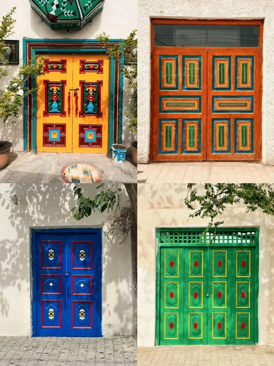 正红、明黄、宝蓝、翠绿等饱和色大胆碰撞,门框上点缀着白色花纹,像是一脚踹翻了上帝颜料盒。
