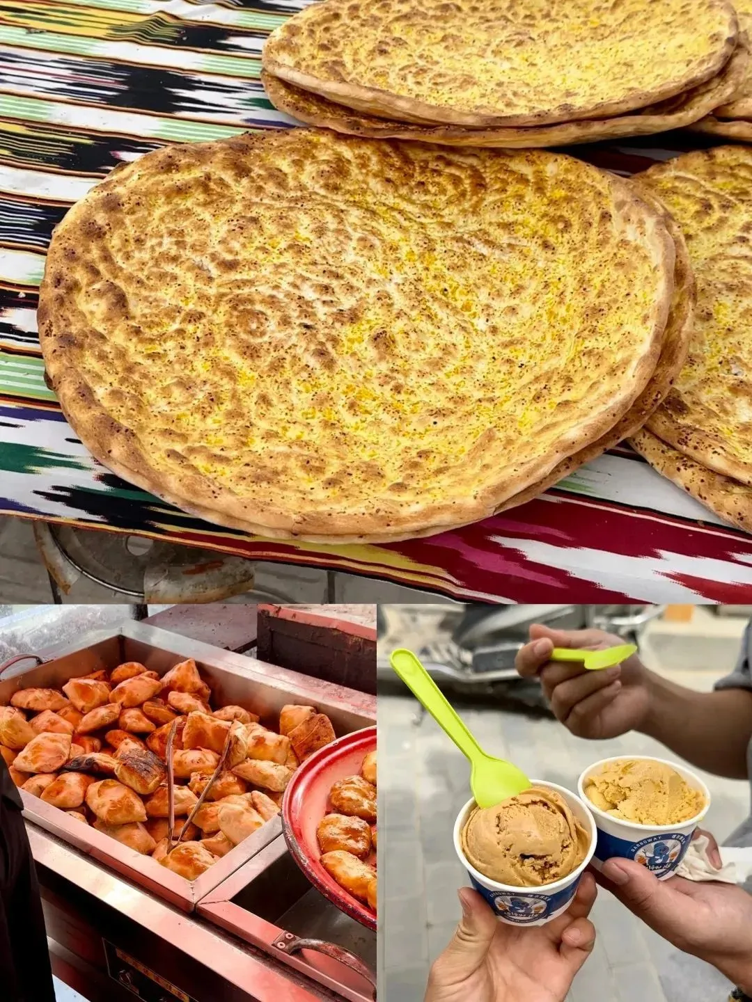 还有那香喷喷的库车大馍、烤包子、大盘鸡、馍坑肉、烤鸽子、羊排抓饭等等。