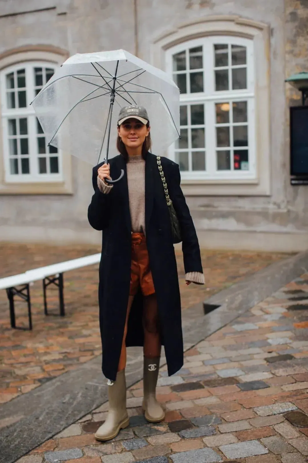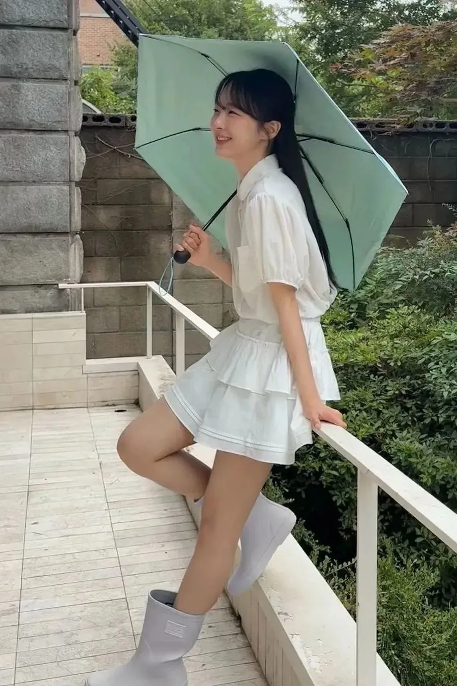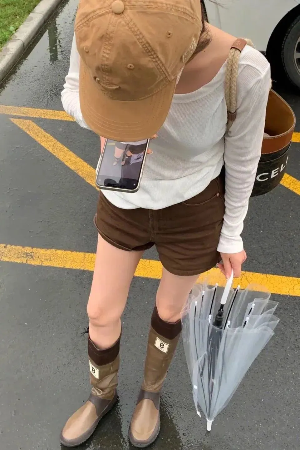 虽然有雨靴助力,但雨季在选择下装的时候,还是要减少一些与雨水接触的机会。那种拖地阔腿裤我们就可以直接放弃,不如改成短裤或短裙这种长度较短的单品,整个人也轻松利落很多。