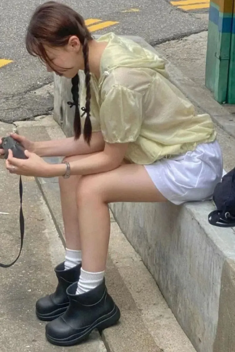夏季最常见的雨靴搭配无非是配连衣裙或短裤,露出的腿部在略宽一号的靴筒下更显纤细,简直就是遮肉满分搭配。和工装、牛仔、卫衣等单品也是配一脸,亮眼的雨靴为穿搭增添重点,怎么看都有种boyish的感觉。