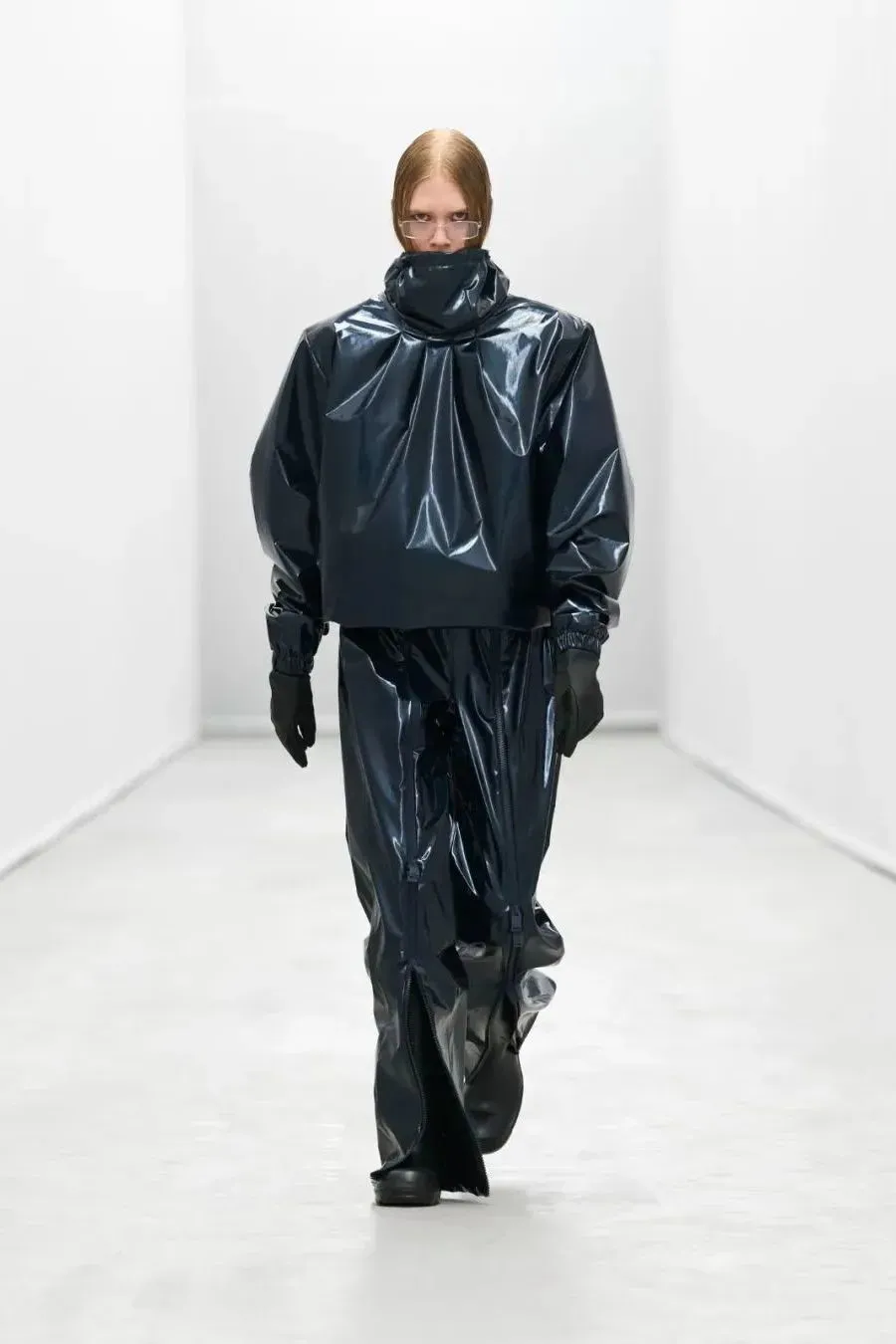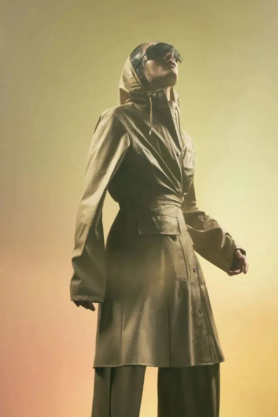 除了户外单品之外,传统遮雨的雨衣在当下也有了别样的时髦解析。就比如说被Ye带火的被称为“雨衣之王”的Rains,是一个来自丹麦的当代雨具品牌,以其极简主义设计、功能性面料和都市时尚风格在全球范围内收获了大量粉丝。