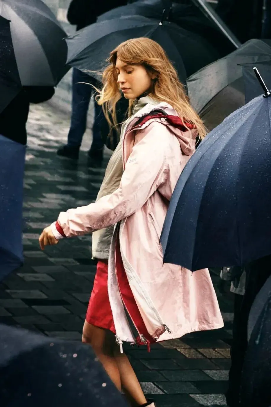 优秀的雨天“上工服”,防水性能必须过关。户外品牌的防水服就是极好的选择,比如速干面料的T恤、尼龙外套等,让你轻松无惧黏腻雨天。